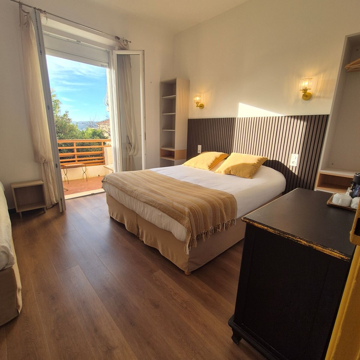 Pouvant accueillir jusqu'à 3 personnes, cette chambre de 21 m2 est de plein pied dans le jardin avec un espace terrasse dédié. Elle a été complètement refaite pour vous accueillir avec le meilleur confort. Elle dispose d'un lit king size séparable en deux lits et d'un lit supplémentaire pour une personne et d'une vaste salle de bain équipée d'une douche à l'italienne.Chambre double Supérieure vue mer